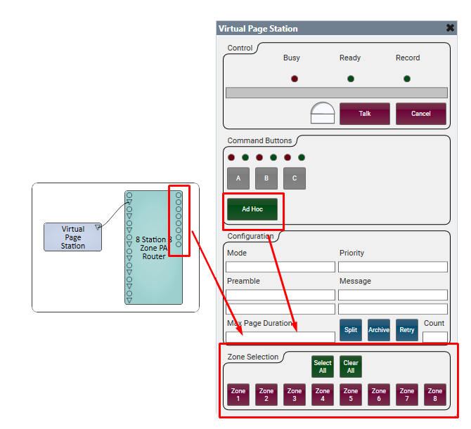 When you have the Virtual Page Station wired to a PA Router, the Virtual Page Station will have Zone Selection buttons at the bottom, one for each Zone in the PA Router.