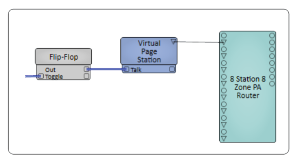 There is a difference in operation between the talk button on the Virtual Page Station and its control pin when the “Latch Talk” button property is enabled. The "latch" feature allows a quick press of the button to latch the button on and a second quick press to unlatch it. If the Page is activated by the Talk button's Control Pin, you can use a Flip-Flop component between the control signal and the Talk pin to control the latch and unlatch.