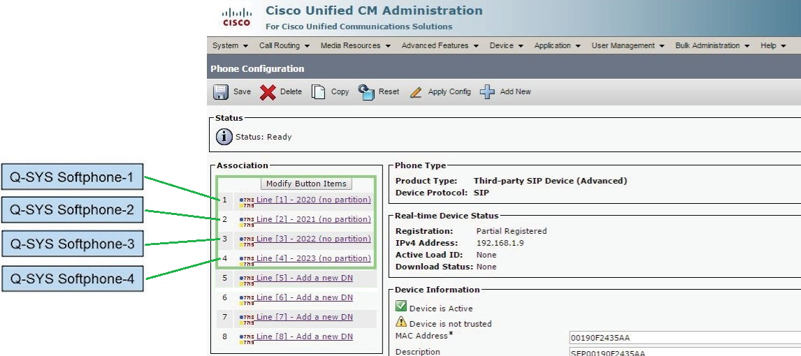 After a Q-SYS Softphone is configured, the Cisco Third-party SIP Device (Advanced) may appear in CUCM with a status of "Partial Registered" as shown below. This is because some, not all, of the lines configured in CUCM for the device have successfully registered. This is not an issue.