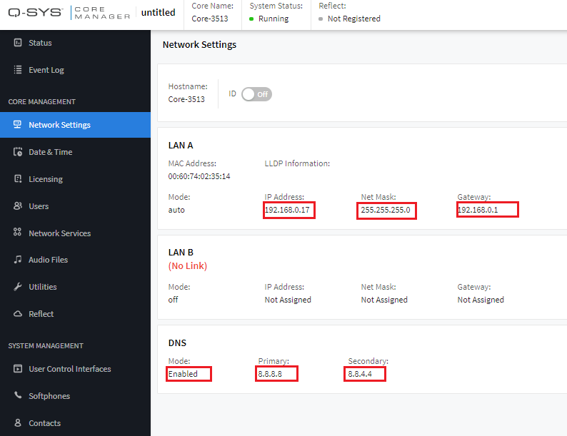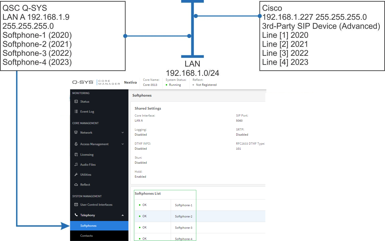 The Q-SYS Softphones are each associated with lines in CUCM. Use Q-SYS Core Manager to configure each softphone.
