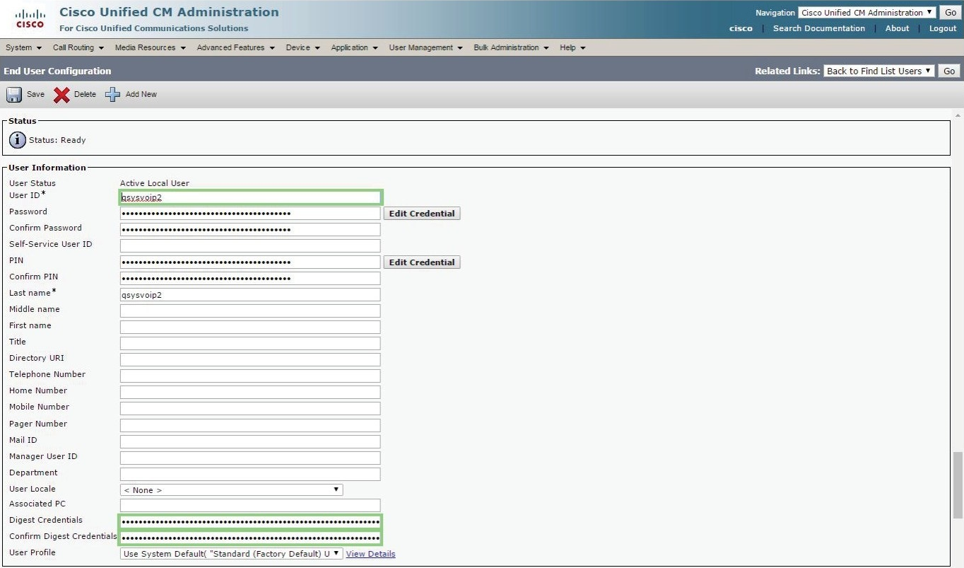 Go to End User Configuration to configure the User ID, and set up and confirm the Digest Credentials.