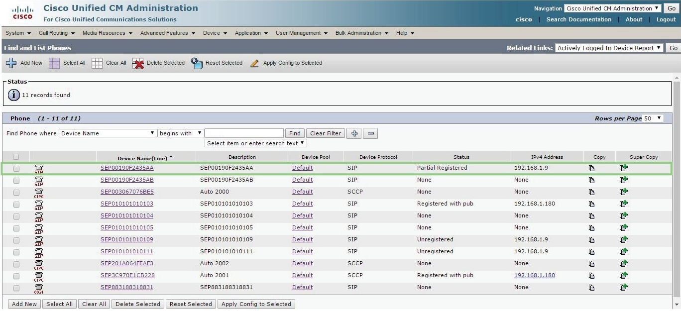 To view the registered device list in CUCM, go to Device > Phone. The phones will be listed by device name.