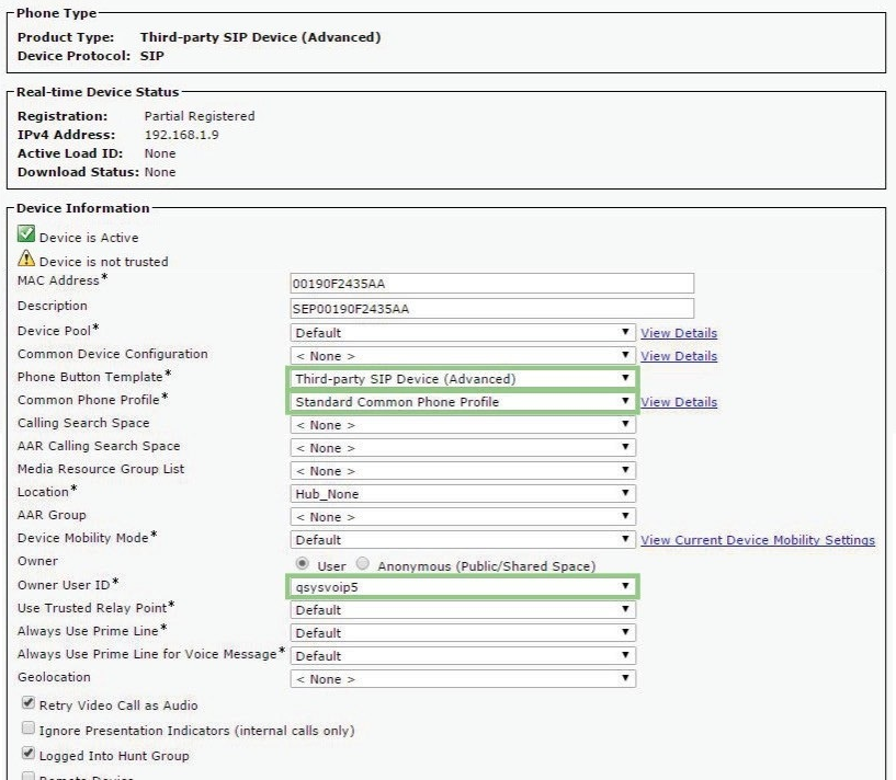 In the Device Information section, configure the Phone Button Template, Common Phone Profile, and Owner User ID. Repeat for each Device (Q-SYS Softphone).