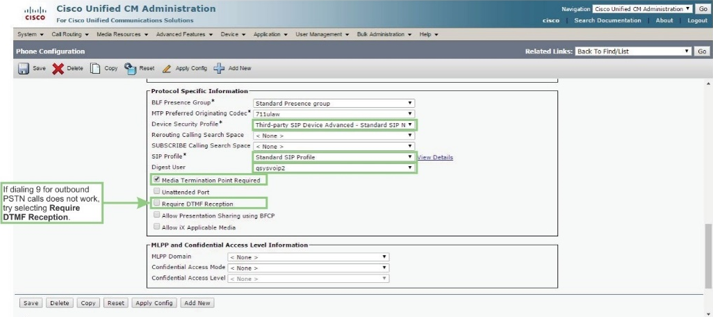 If there are problems making outbound PSTN calls after dialing 9, try selecting Require DTMF Reception.