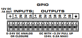 The GPIO In component represents the GPIO INPUTS connection pins on the rear of the QIO-FLEX4A. Use one of the included 14-position black Euro connectors.