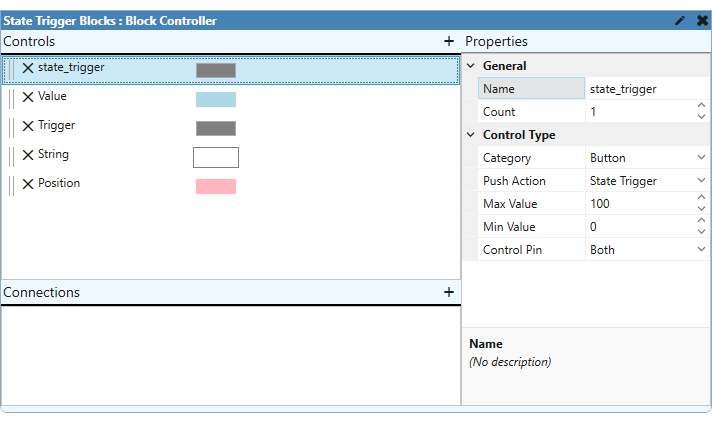 Users can click the button to trigger a command, just like regular triggers. However, State Triggers can have both input and output control pins. These controls have configurable Min and Max values to give flexibility with the number of states.