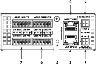 ID Button – Locates the QIO-AES8x8 in Q-SYS Designer Software and Q-SYS Configurator.
