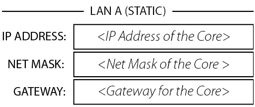 - Static or Auto – Displays next to LAN A, indicates if the Core's IP Address is Static or Automatic.