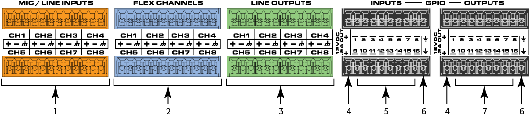 All audio inputs and outputs use one 3-position, 3.5mm Euro connector for each channel. GPIO uses one 10-position 3.5mm Euro connector for each row. Configure all inputs and outputs in Q-SYS Designer.