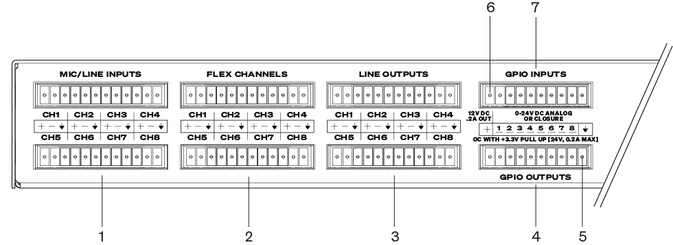 - Flex Channels — (8 channels - blue) Configurable as Mic/Line Input or Line Output per channel