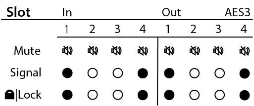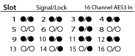 - Lock – Displays a solid circle when the AES3 clock is in sync and locked for the associated channel.