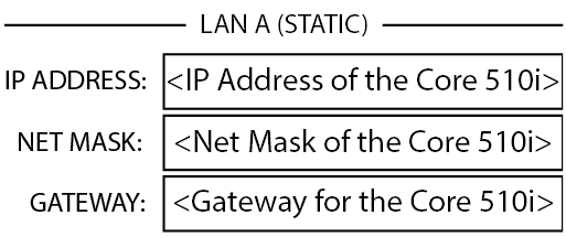 - Static or Auto – Displays next to LAN A, indicates if the Core's IP Address is Static or Automatic.