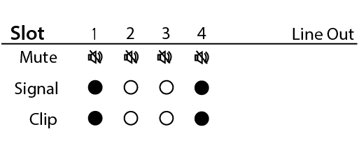 The Line Out card status screen shows the Mute state, Signal presence, and Clip status of each of the 4 output channels.