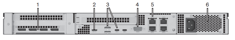- Q-SYS LAN ports (RJ45): from left to right; top row is LAN A and LAN B, bottom row is LAN C and LAN D. (Only LAN A is supported.)