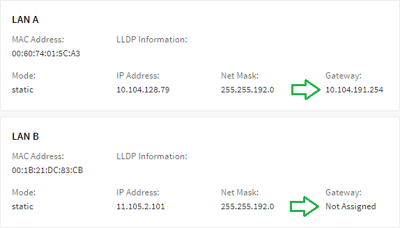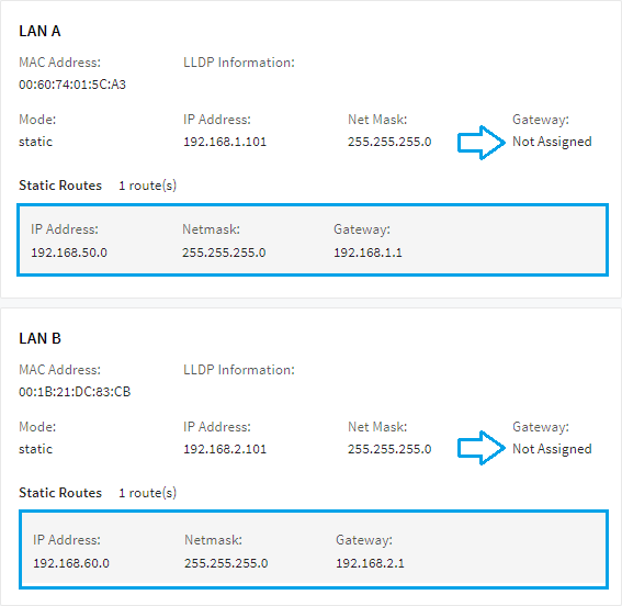 In this example, LAN A and LAN B are using Static IP address assignment (preferred), with each on a separate subnet and with only a single Default Gateway assigned. This is a proper configuration.