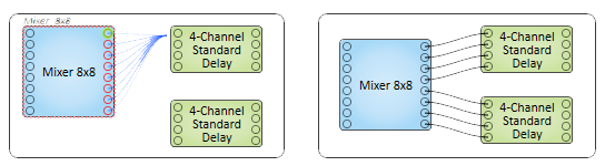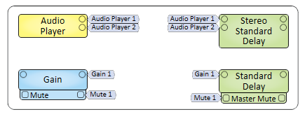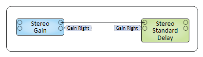 The wiring between audio signal pins are the means by which the audio signal is passed from one DSP component to another. The number of signal pins, for most components, is variable and set in the component's Properties. Input (sink) pins are on the left, output (source) pins are on the right. Some components do not have both inputs and outputs.