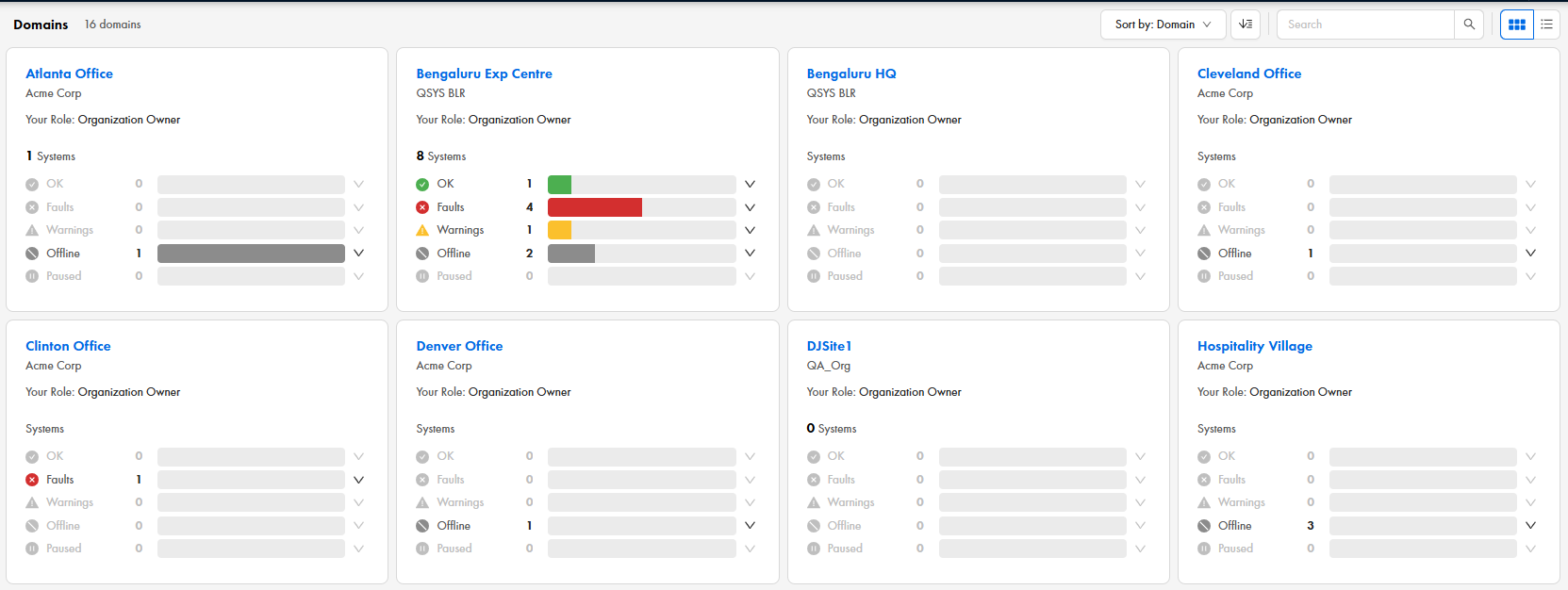 Domain View - Cards View: This is the default view in Q-SYS Reflect.