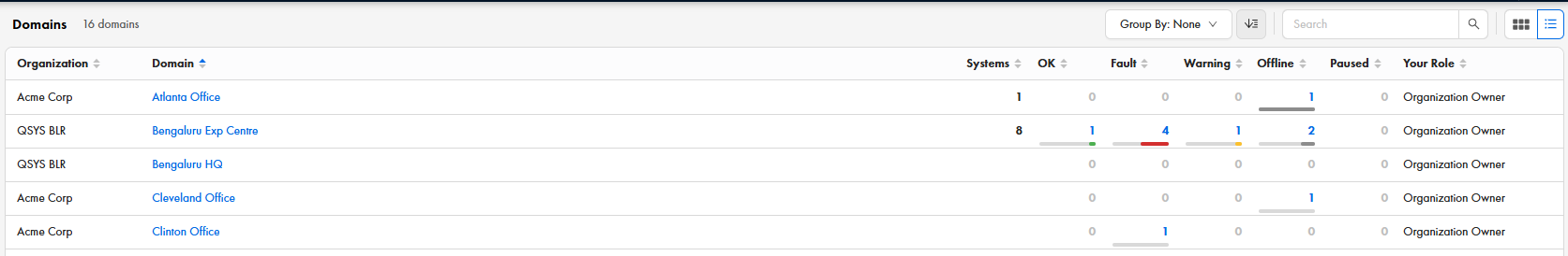 For each Domain, the following data is provided. If any Domains are reporting Systems in a Fault, Warning, or Offline status, select the Domain to investigate the list of Systems and their statuses.