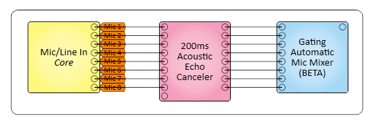 In this example, there are 8 microphones routed through an Acoustic Echo Canceler to eliminate echos for the remote caller's (Far-End caller's).
