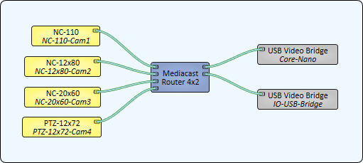 In this example, the Mediacast streams from four Q-SYS cameras can be routed to any of the USB Video Bridge-capable devices in the design – in this case, a Core Nano and an IO-USB Bridge.