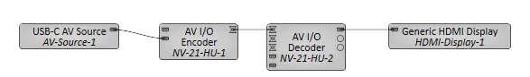 A single USB-C AV source signal (video) is encoded by one NV-21-HU network endpoint, decoded by another NV-21-HU network endpoint, and sent to an HDMI display device.