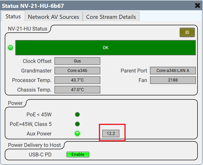The NV-21-HU Status component provides detailed information about the NV-21-HU, including hardware health, network AV source details and statistics, Q-SYS Core audio streaming details (if applicable), and USB audio and video bridging details (if enabled).