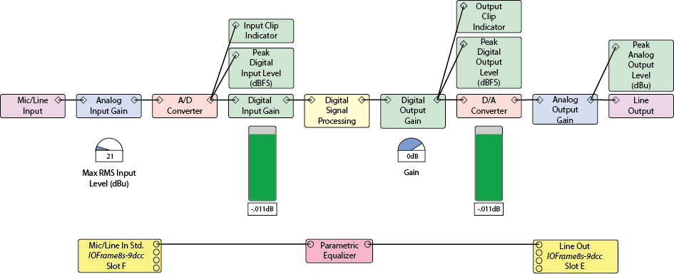 The main purpose of setting the gain structure is to achieve optimum signal to noise ratio, while avoiding clipped signals. The following signal flow diagram provides a detailed view of a typical analog-to-digital-to-analog processing chain. The pair of critical controls that determine the gain structure are the Max RMS Input Level (dBu) and the Digital Output Gain. The pair of signal level meters that are used to properly set the controls are the Peak Digital Input Level (dBFS) meter and the Peak Digital Output Level (dBFS) meter.