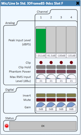 An input source device (microphone, instrument, CD player, etc.) has a nominal RMS output level usually specified in dBu where 0dBu is equivalent to 775mV. When setting the Mic/Line Input Max RMS Input Level, a good starting point is the nominal RMS output level of the device plus some headroom. For example, if the nominal output level of the device is +4dBu and the required headroom is 17dB, the resulting Max RMS Input Level is +21dBu. With the system up and running adjust the Max RMS Input Level such that the Peak Digital Input Level meter shows a signal that is as close to 0dBFS (0dB Full-Scale) as possible but does not cause the A/D Converter to clip, shown by the Clip indicator. Adjust the digital gain to produce a digital signal at the desired level. A typical setting is 0dB. This ensures that the maximum signal into the DSP is at 0dBFS.