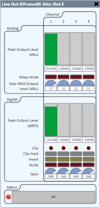 An output destination device (recorder, amplifier, powered loudspeaker, etc.) has a nominal RMS input level usually specified in dBu. When setting the Line Output Max RMS Output Level, a good starting point is the nominal RMS input level of the device plus some headroom. For example, if the nominal input level of the device is +0dBu and the required headroom is 17dB, the resulting Max RMS Output Level is +17dBu. With the system up and running adjust the Digital Output Gain such that the Peak Digital Output Level meter shows a signal that is as close to 0dBFS as possible but does not cause the D/A Converter to clip, shown by the Clip indicator.