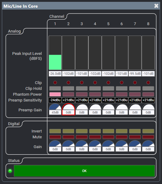 Program sources can vary greatly in level and dynamic range. The key strategy is to set a good normal level and make sure the peak and transient levels do not clip the Core's analog inputs.
