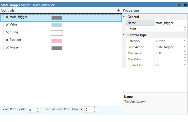 Users can click the button to trigger a command, just like regular triggers. However, State Triggers can have both input and output control pins. These controls have configurable Min and Max values to give flexibility with the number of states.