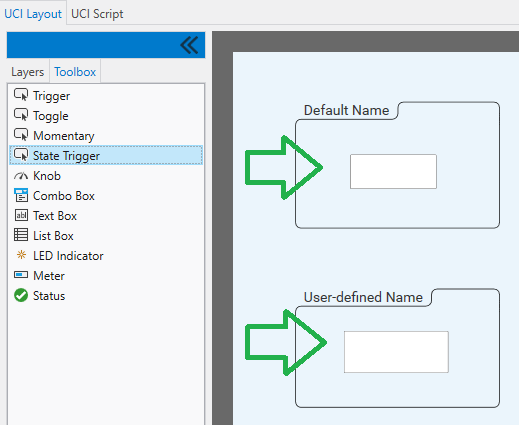 - In UCI Controller, State Trigger is available from the Toolbox. The button can then be linked with other controls in the design like any other UCI control.