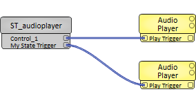 And in this example, two State Trigger controls have been dragged into a UCI from the Toolbox. One uses its default name (Control_1) and the other uses a user-defined name ("My Special State Trigger"). Each control has its output pin exposed (Control Pin property set to "Output") in the UCI Controller component for the associated UCI (called ST_audioplayer), which is each wired to an Audio Player component.