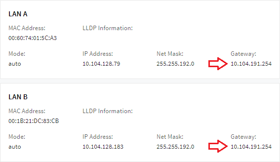 In this example, both LAN A and LAN B are set to Auto (DHCP) mode. Both interfaces are on the same subnet, so both use the same Gateway (also called the Default Gateway). This configuration may result in LAN A or LAN B communication faults.