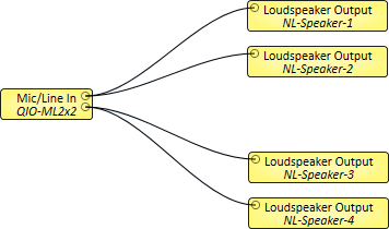 In this example, audio from an analog device (or perhaps two different devices) connected to a QIO-ML2x2 peripheral's two Mic/Line Input channels is routed to two pairs of Q-SYS Products.