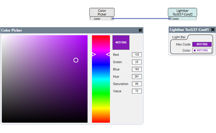 Tip: Alternatively, you can send a hex value or text value ("red", "white", "blue", etc.) to the Lightbar's input Color control pin. The Color Picker component, available from the Control Components category, provides an easy way to visually select a desired color and output its corresponding hex value to the Lightbar component.
