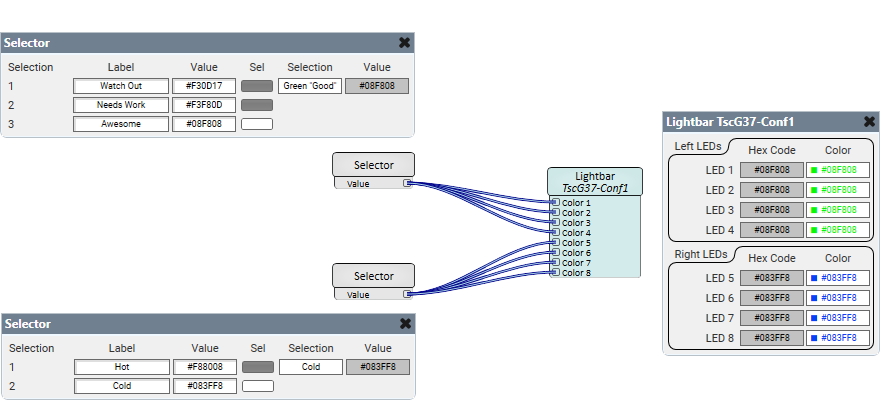 In this example two Selector components are used to send different "status" colors to each side's LED lightbar. (The Light Bar Drive Mode is set to "Set color for each LED".)