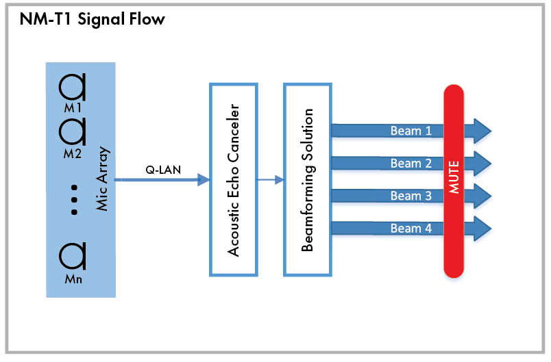 Audio signals captured by the NM-T1 mic array are sent on the Q-LAN network to the Acoustic Echo Canceler (within the Mic In component), which are then formed into beams. Muting occurs across all four beams simultaneously.