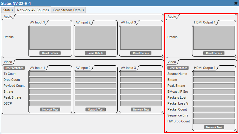 The NV-32-H Status component provides detailed information about the NV-32-H, including hardware health, network AV source details and statistics, Q-SYS Core audio streaming details (if applicable), and USB audio and video bridging details (if enabled).