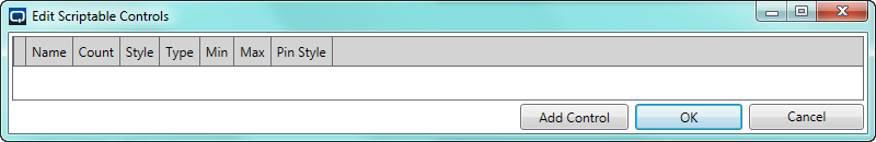 - Click Add Control. Another line is added to the dialog, much like a spreadsheet. On each line, you can change the values to match your intended purpose. You can name the row of controls anything you like with spaces or not, but remember that whatever you call each row of controls will be the name you use to refer to the control(s) within the Lua script. Regarding the name, try to balance the need to describe the control's use and simplicity within the script.